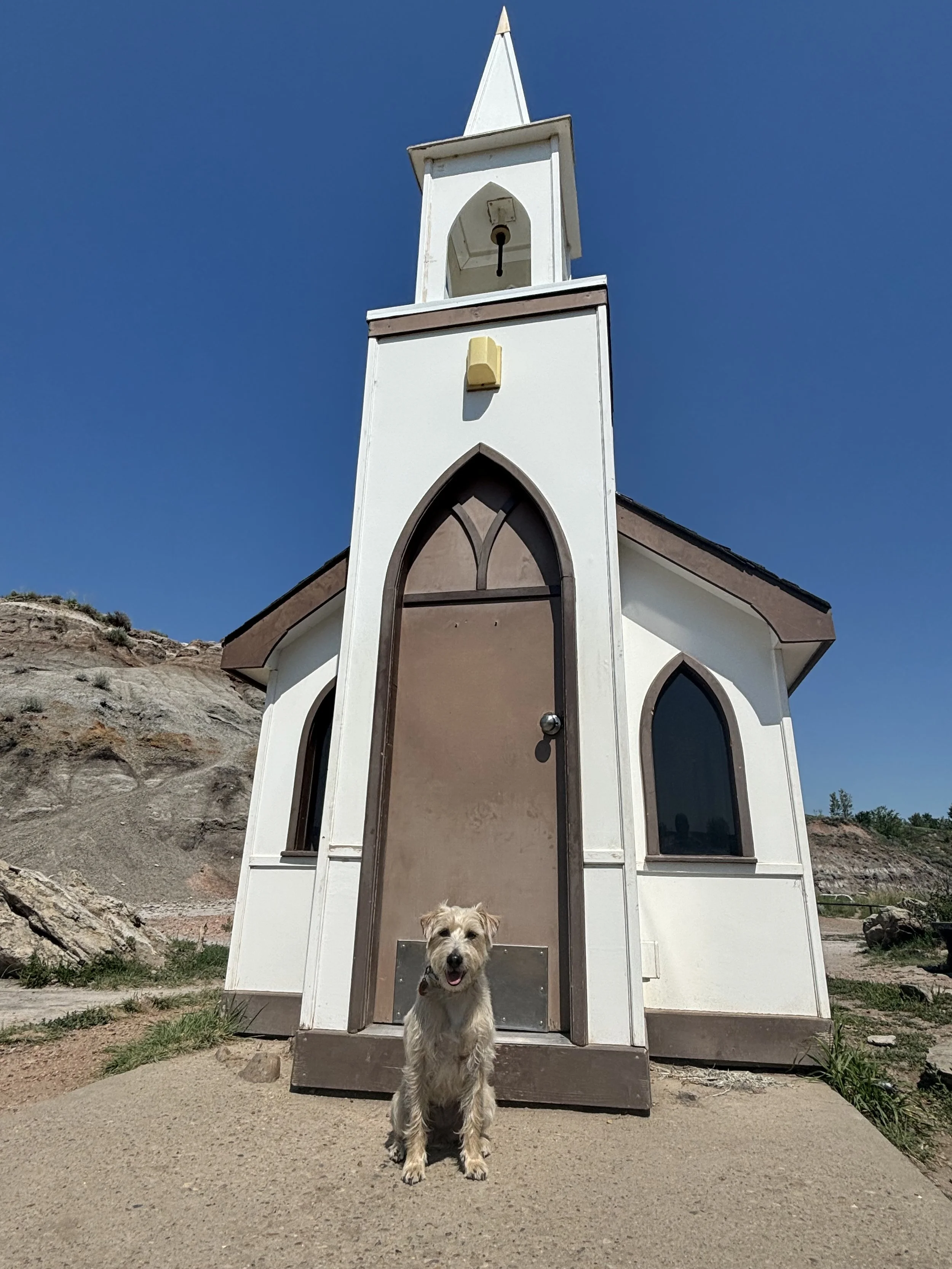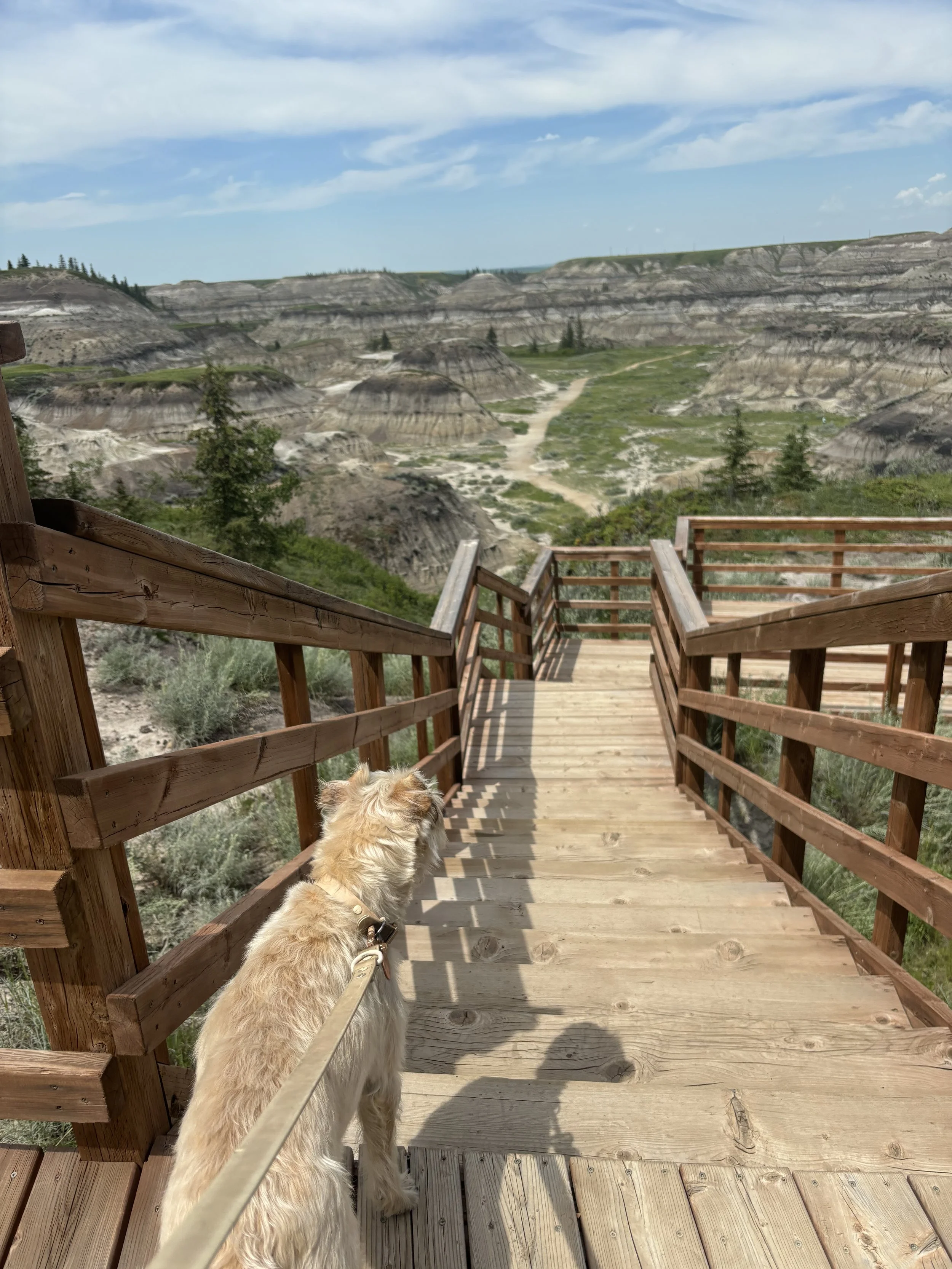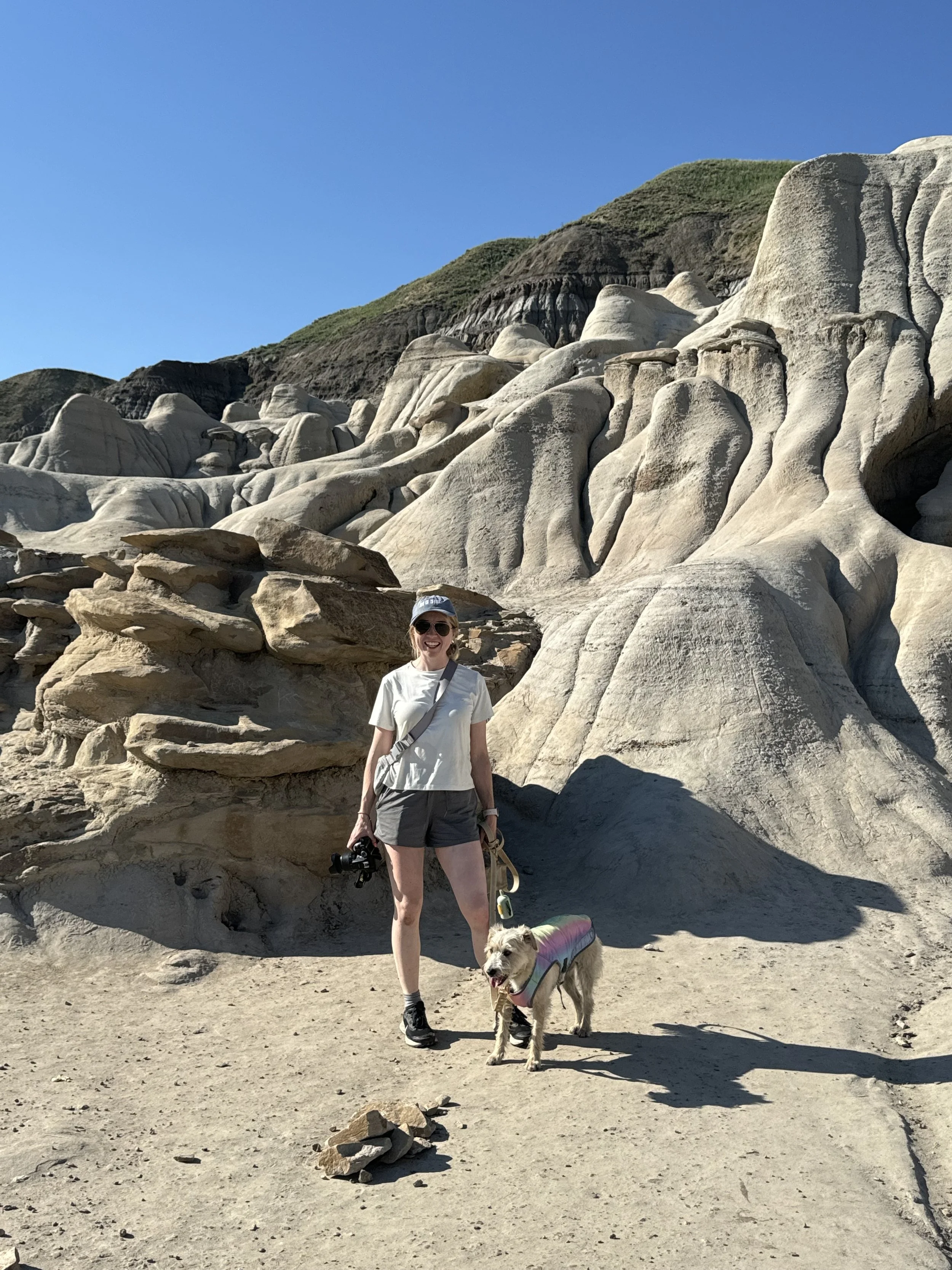 On day two, we travelled north of Drumheller, starting with Michichi Creek Boardwalk, which travels across wetlands, educating walkers on the surrounding flora, fauna and animals by way of interpretative signs. As we journeyed back to the town, along the Dinosaur Trail, we stopped at Horse Thief Canyon, a vast canyonland named after the antics of the horses who would disappear into the valley and return home with different brandings. Another interesting sightseeing spot is the Little Church, a place of worship set on the side of the road which accommodates up to six parishioners at a time during its regular services. The Badlands Interpretative Trail, located at the Tyrell Museum, is a 1.4km trail leading into Midland Provincial Park and is a safe way to explore and learn about the geography and formation of the badlands. Although a little hot, it was a nice trail to take with Rita. Dogs are not allowed in the museum but be sure to pop into the gift shop for some dino merch.