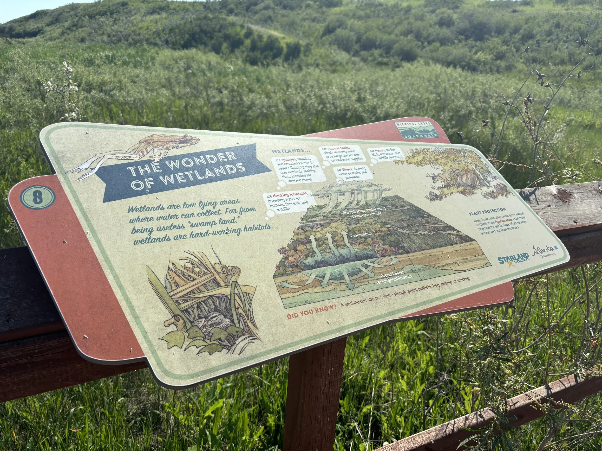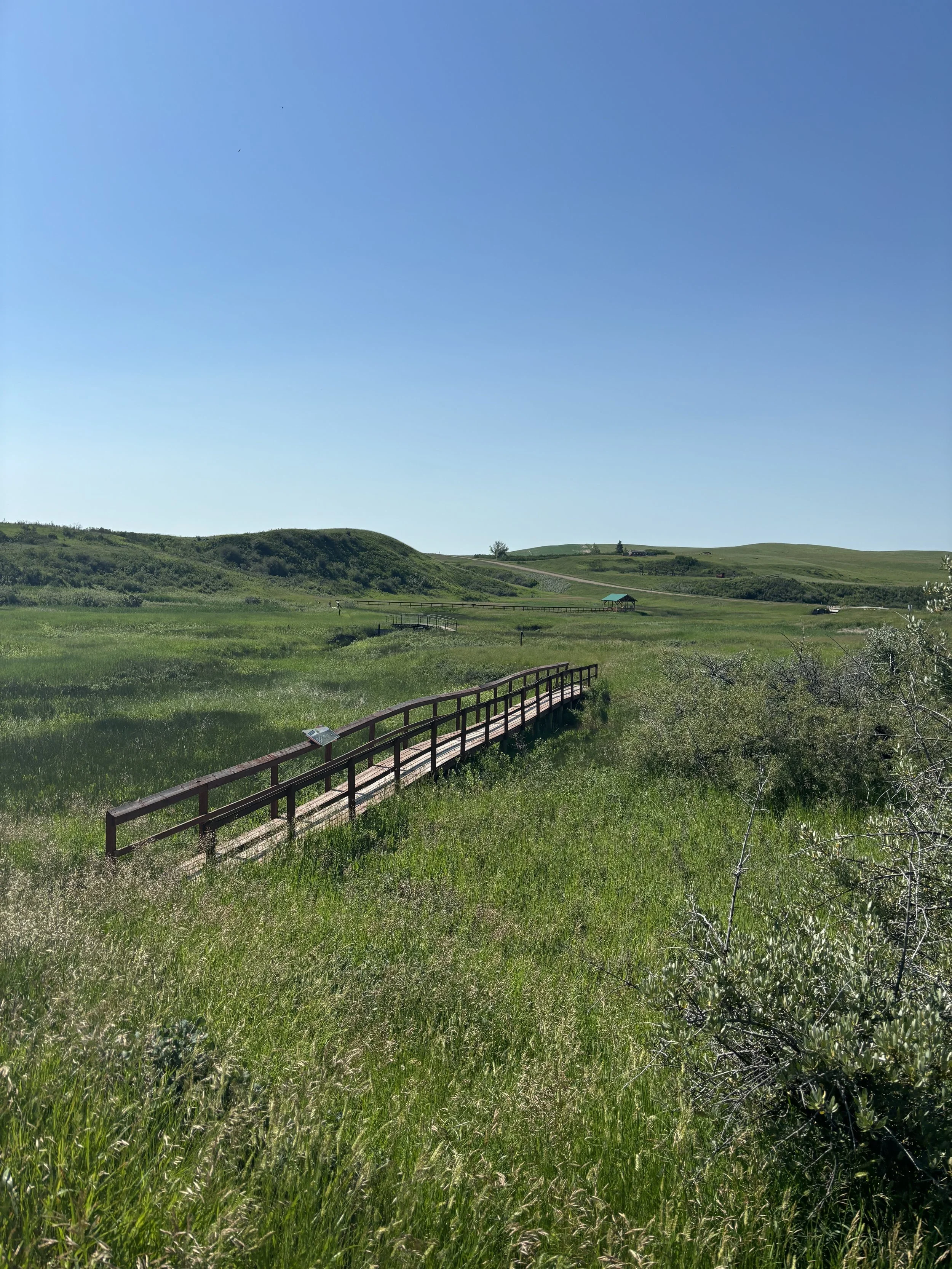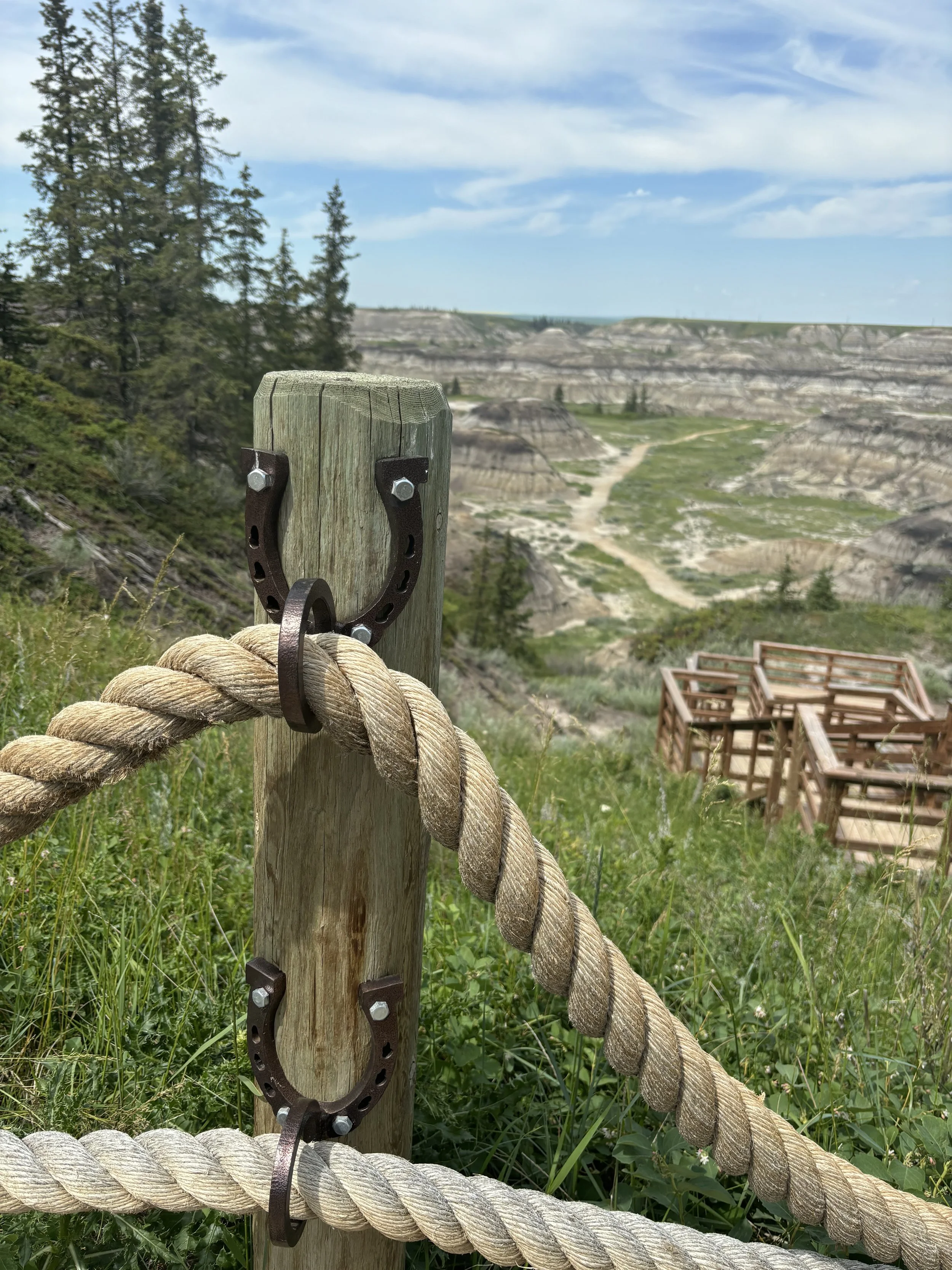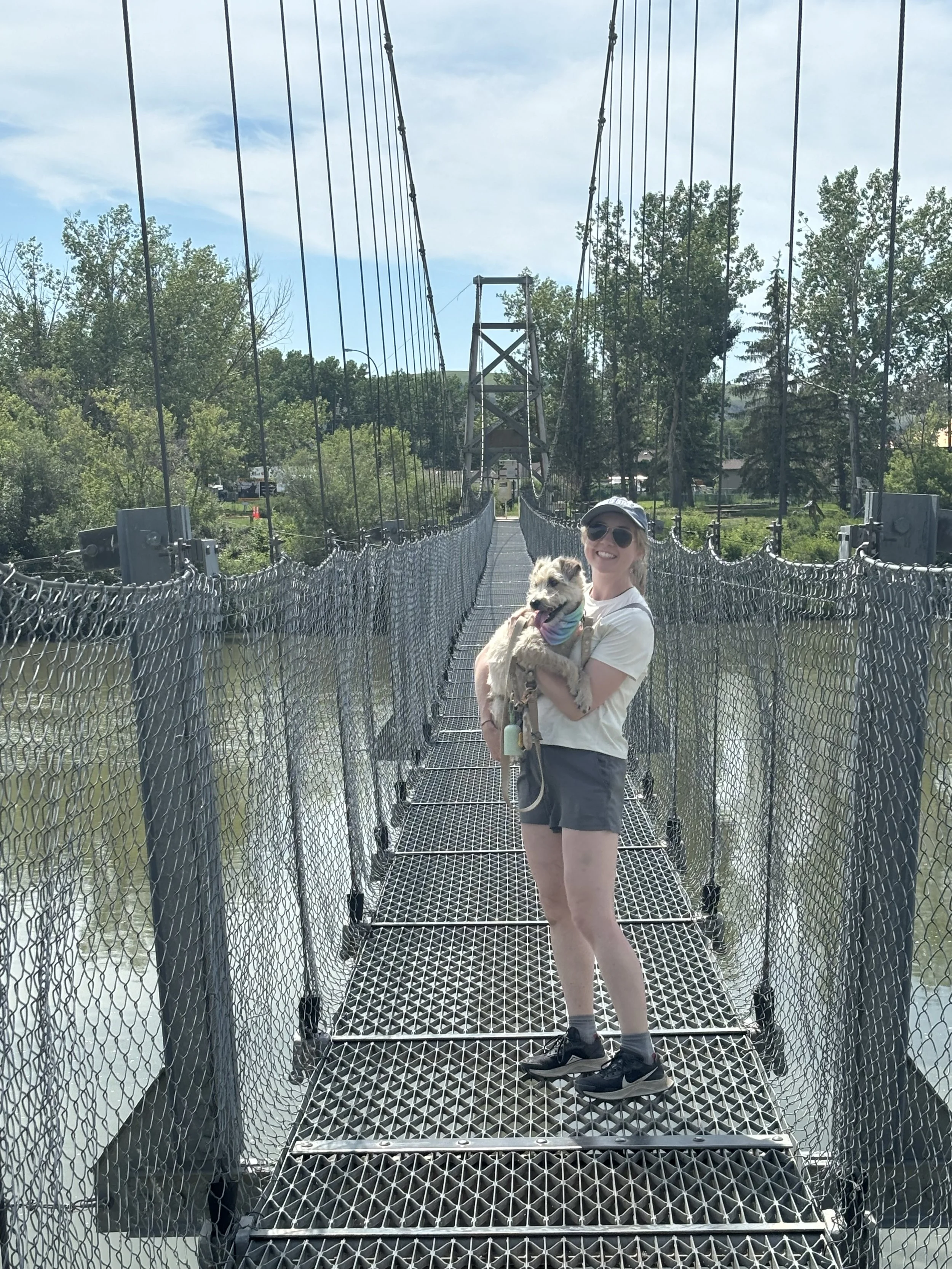 The Star Mine Suspension Bridge stretches across the Red Deer River, with its history rooted in the lives of the miners. Prior to the initial construction of the bridge, the miners took rowboats to work. The bridge just reopened this year after major renovations to ensure it was safe for visitors to cross. It didn’t sway too much, but the floor was a wide metal grating, so I carried Rita across. It was a fun stop on our trip!