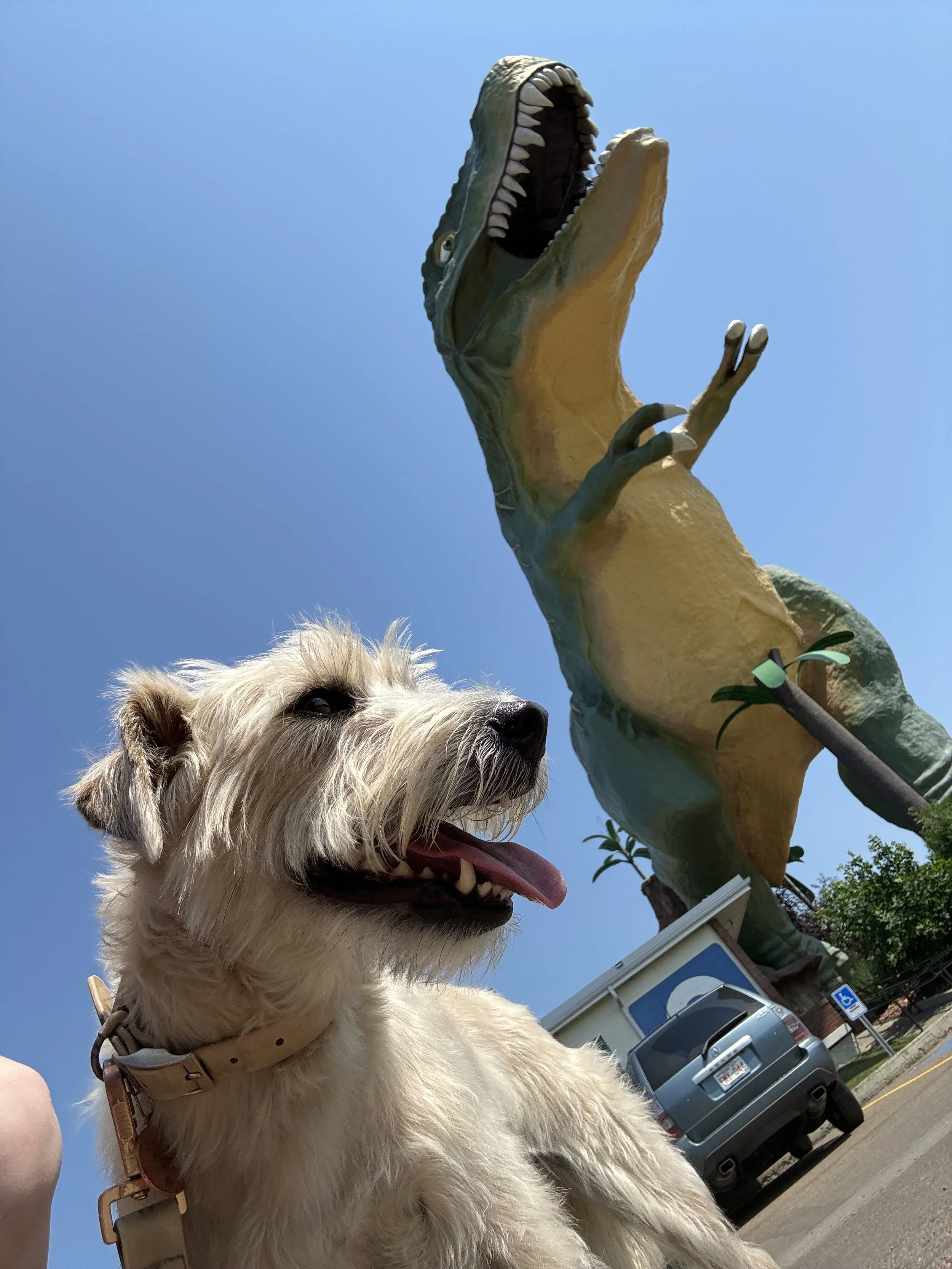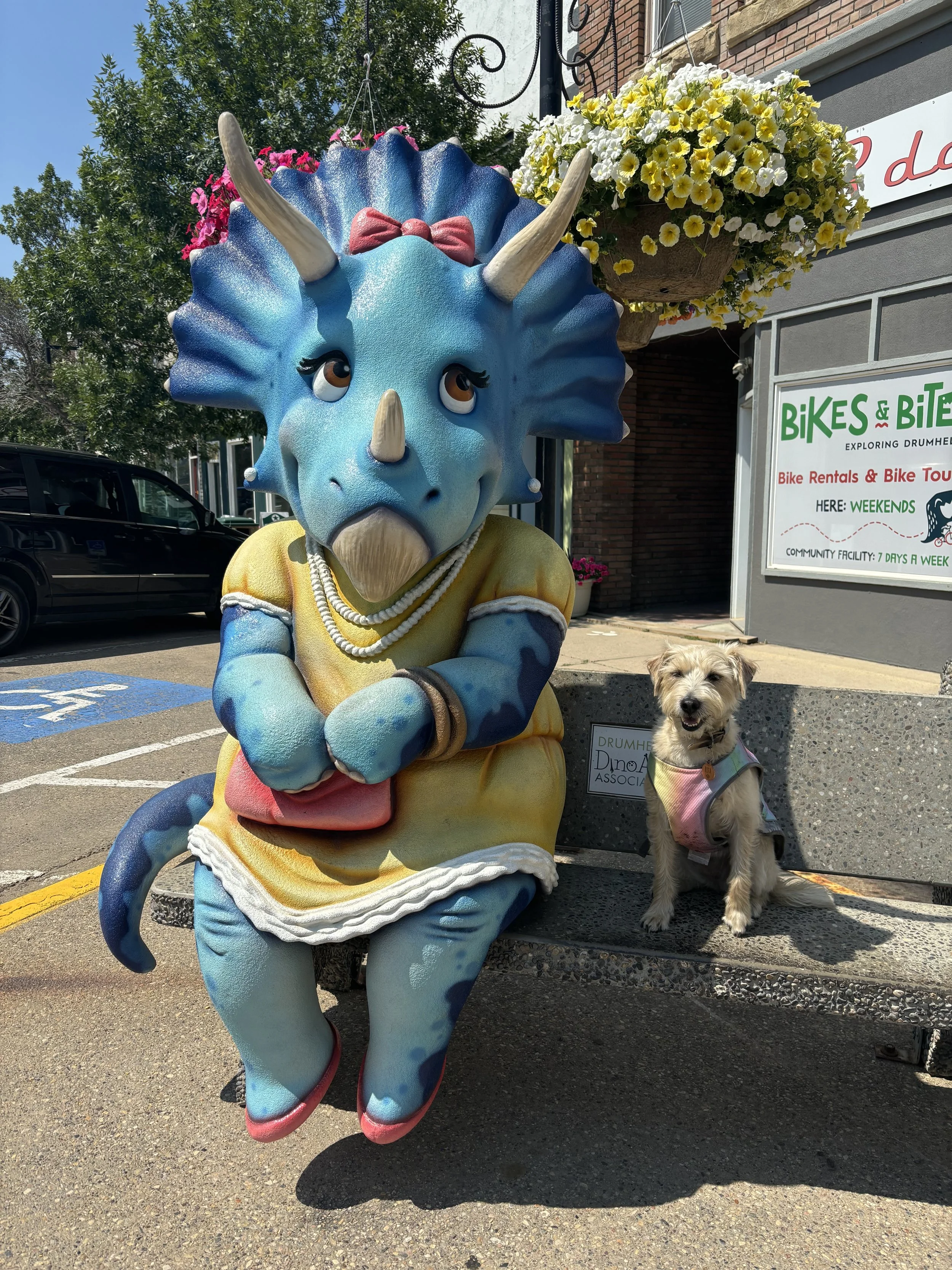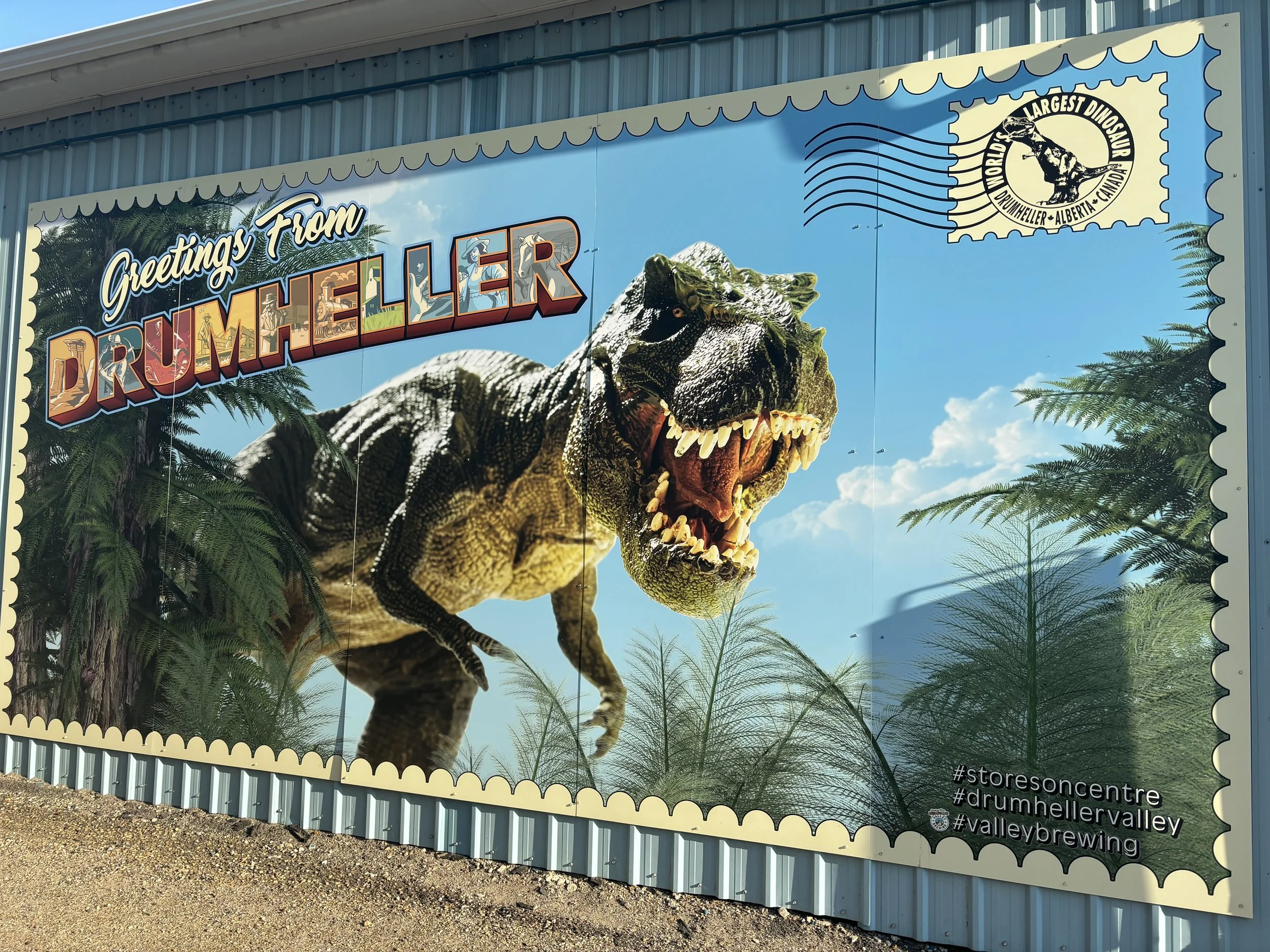 Back in downtown Drumheller, we wandered along the DinoArt Walk for some fun photo opportunities with the dinosaurs scattered across town. We also enjoyed the dinosaur-themed business names and décor. Dog-friendly gift shops include The Faux Den and The Fossil Shop. On this hot day, we stopped at Valley Brewing’s dog-friendly patio for a drink. I also grabbed an iced coffee from Rocky Mtn Roasters, who have a street-side patio welcoming dogs. The highlight of the town is the World’s Largest Dinosaur, Tyra, standing at 26.3m.