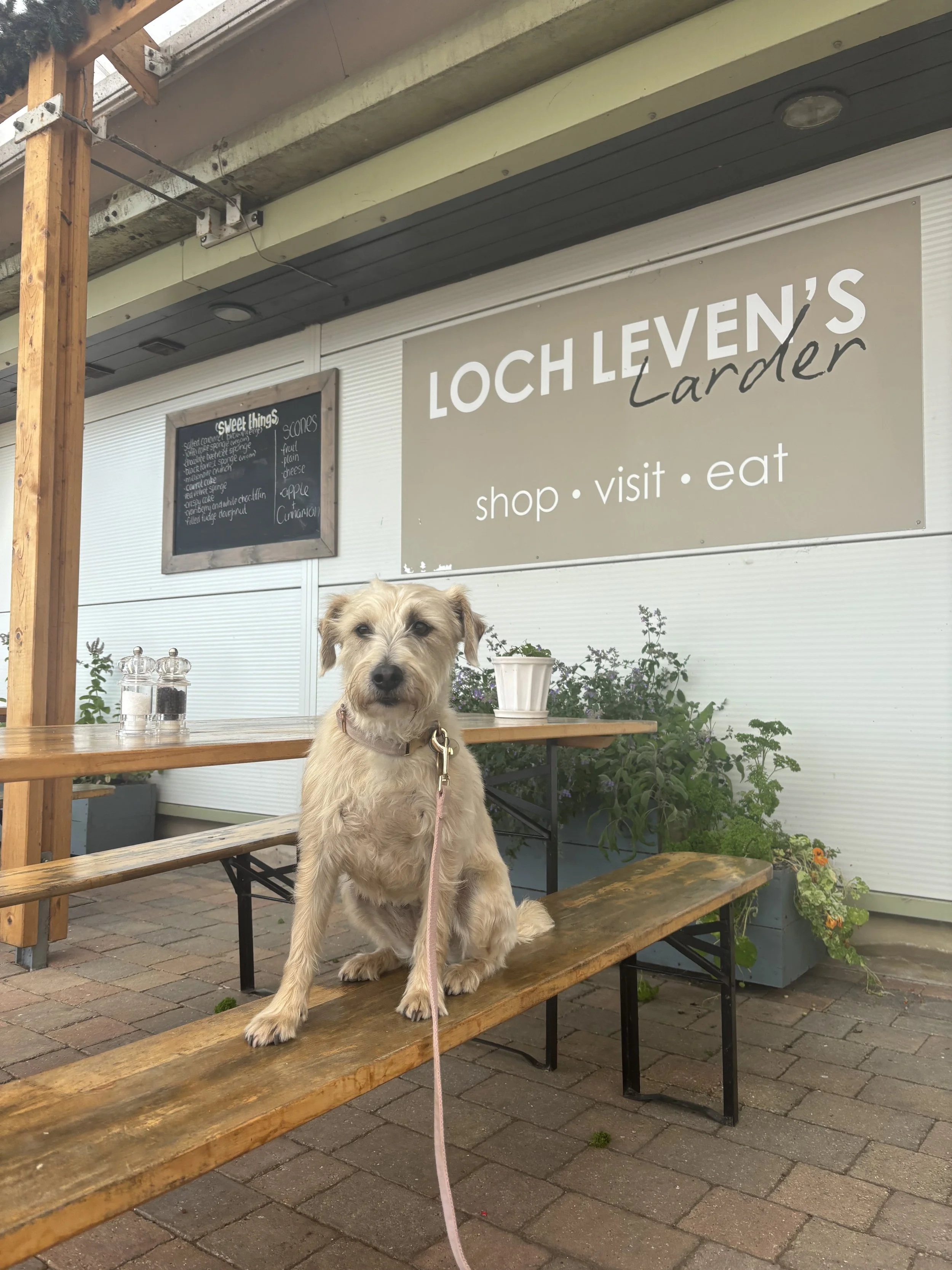 The farm-to-table Loch Leven’s Larder welcomes dogs on their covered patio. I had a really delicious artichoke and avocado salad and we all got iced coffees. There were plenty of water bowls with a dedicated tap for the dogs. Rita was happy to lie down and rest after the long hike. Afterwards, I spend time browsing the gift shop. Although Rita wasn’t allowed inside, she benefitted from the wide range of dog gifts on offer.