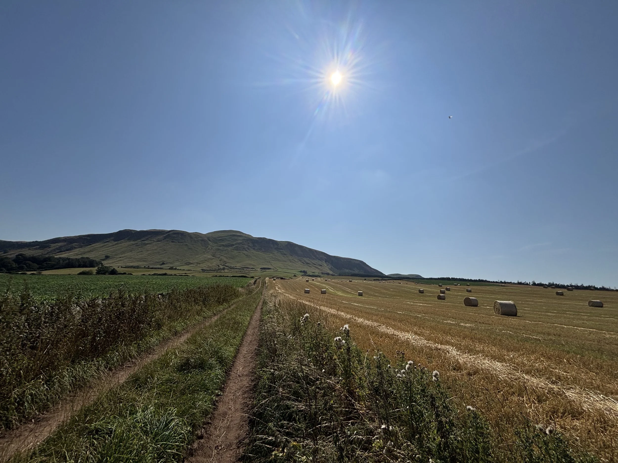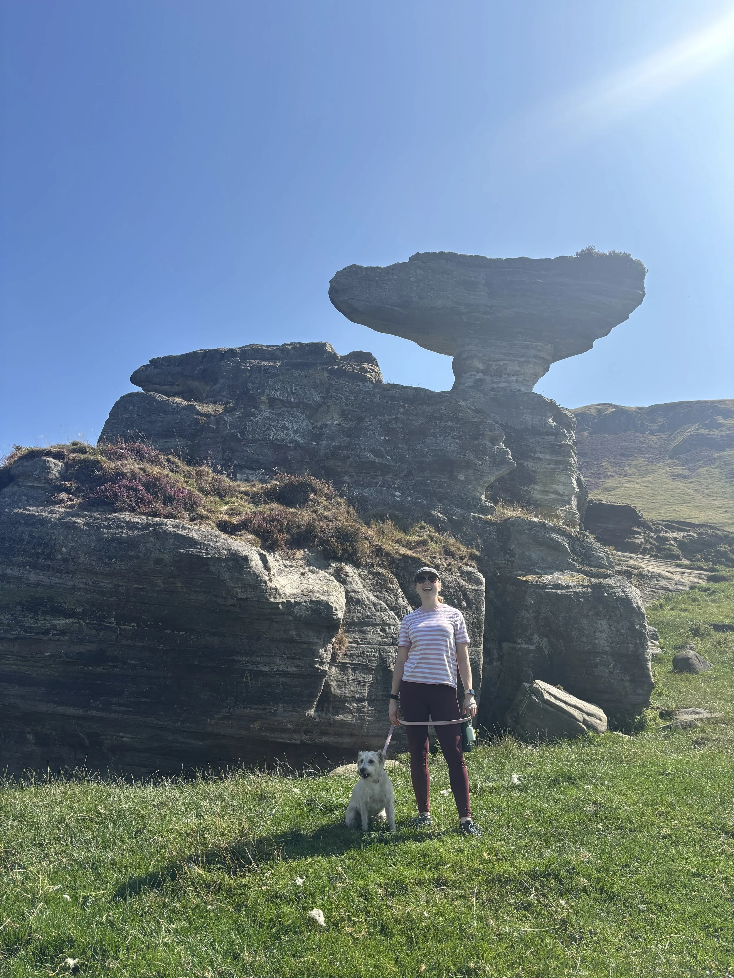The Lomond Hills Regional Park is in Fife, a 20-minute drive from Kinross. We tackled the 9km loop of East Lomond, an extinct volcano. After parking in one of the road-side laybys, we took the laneway that marked the beginning of the hike. A lot of the route consists of tracks through fields, some of which contain livestock, so we put Rita on the lead at these points. Just before the steep incline sits an interesting rock named The Bonnet Stone, featuring a mushroom-shaped ledge. The information board tells of the folklore surrounding the cave that sits within the rock formation, the Maiden’s Bower, involving a runaway maiden and a forbidden love affair. However, it’s likely the name was distorted from “Maiden Bore”, referring to the initial discovery of a mining source.