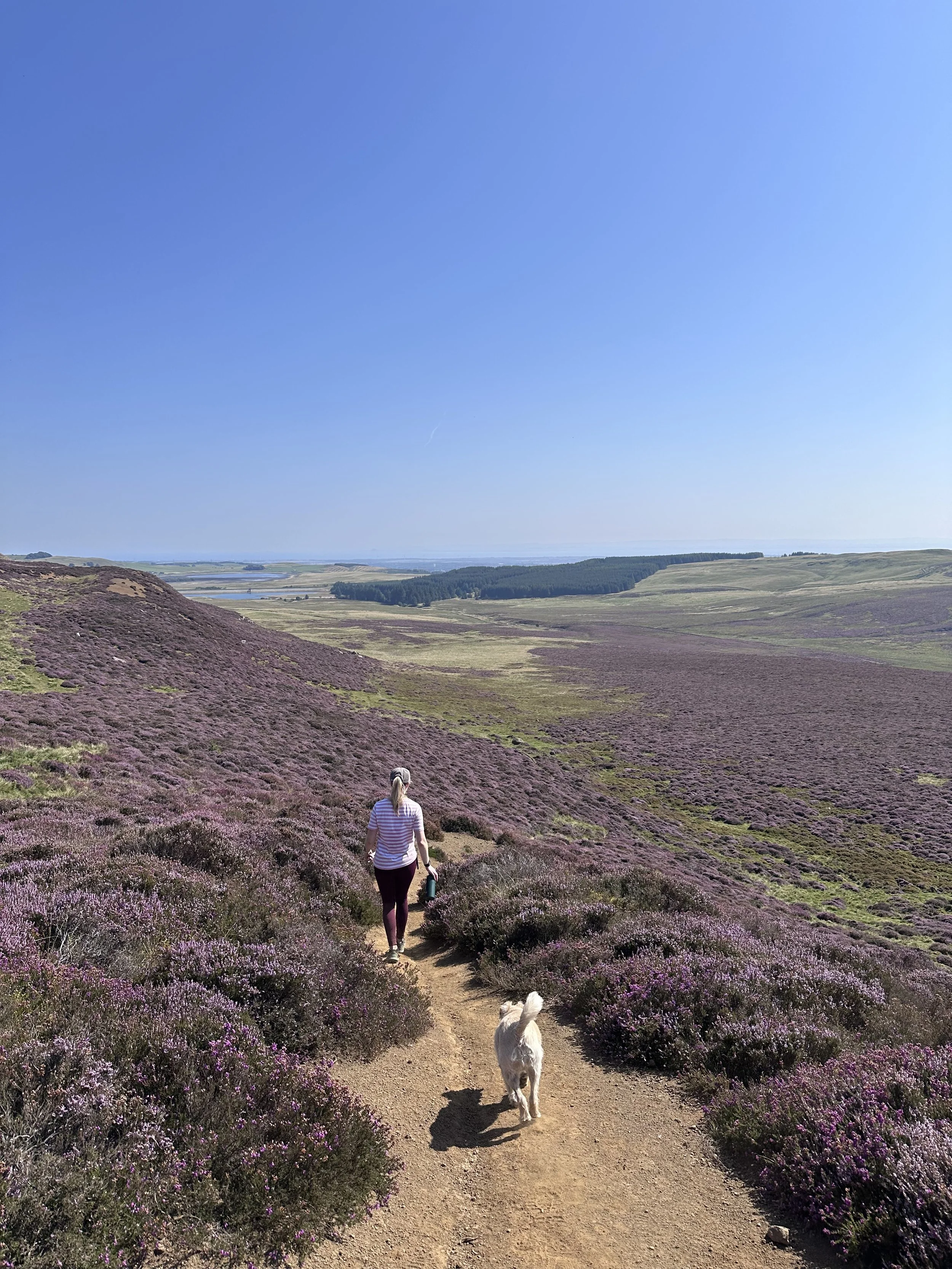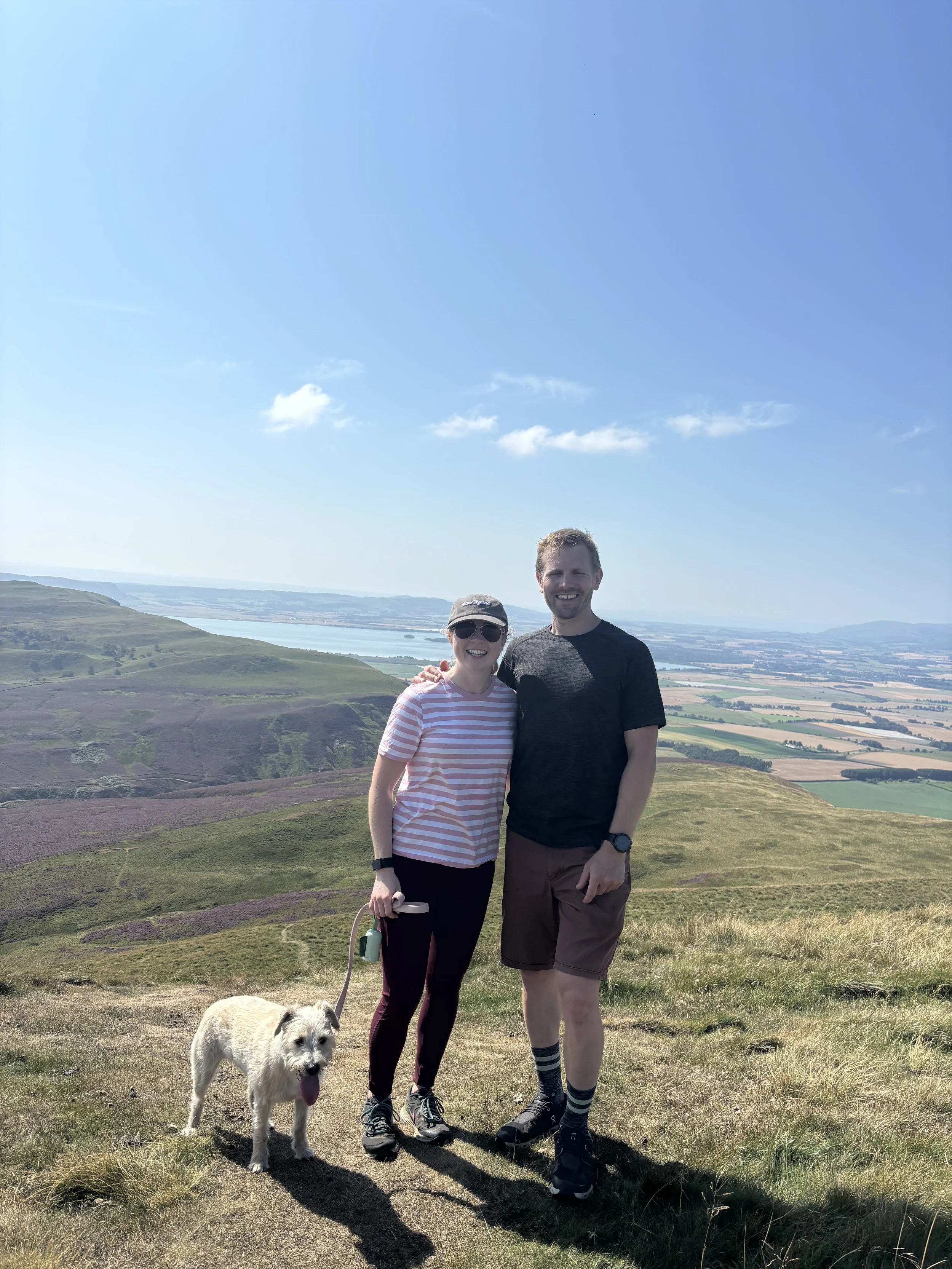 From here, we continued to the summit. This was a challenging climb, not aided by the 25-degree weather. Rita needed plenty of water breaks. From the top, we enjoyed views across the rolling hills of Fife, and out over Loch Leven. The heather was in full bloom too which made for a colourful scene.