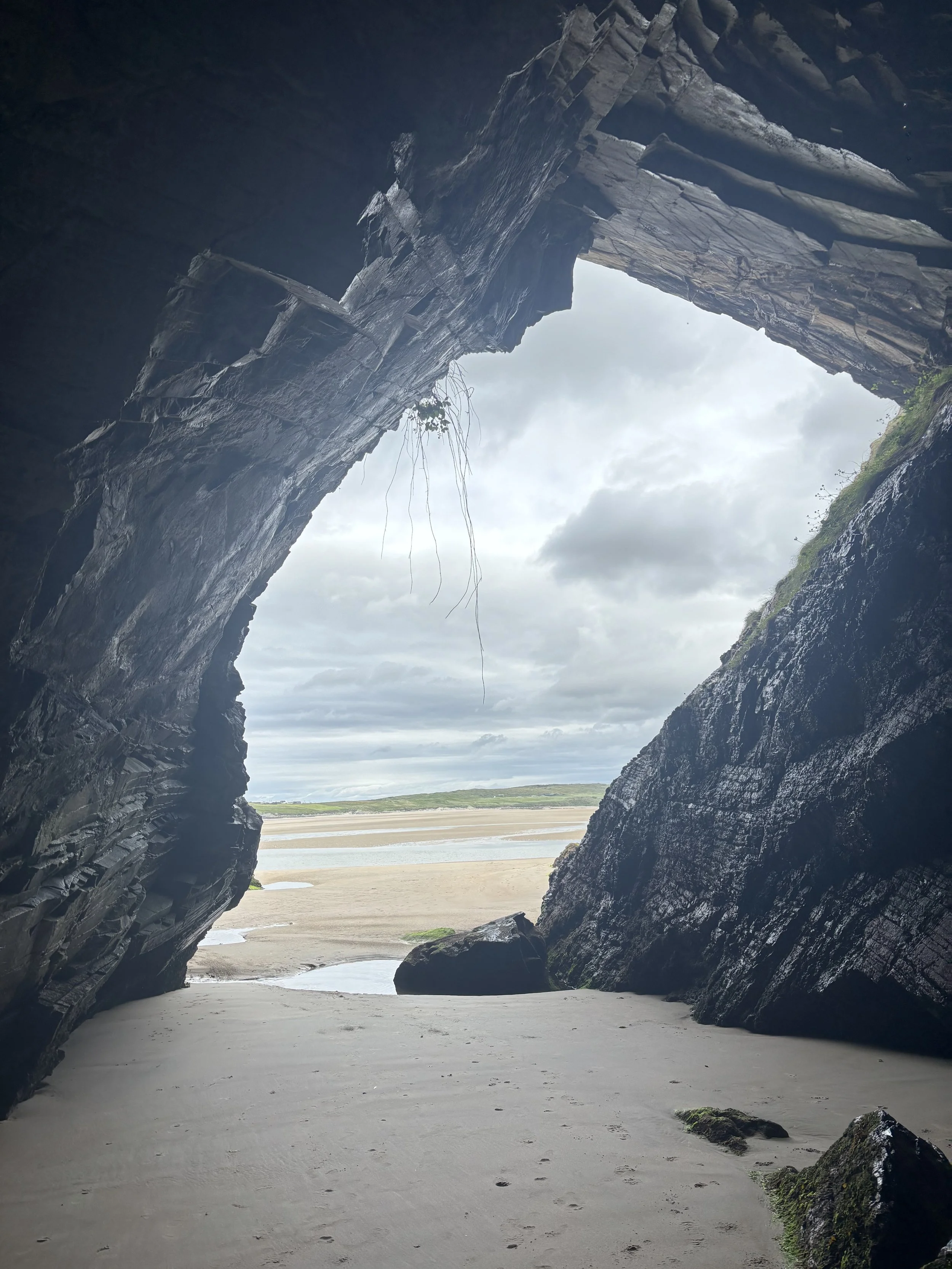 The next magical stop on the peninsula was the Caves of Maghera, a collection of over 20 caves sitting on an expansive white sand beach. Most importantly, you must only visit when the tide is out (or on its way out), and for us this was around midday. There’s a well-maintained private car park which cost €4, and from here we followed the trail down to the beach. There was still a lot of water lying on the beach so we got our feet and paws a bit damp. The caves were fascinating; as soon as we entered it felt like the sound of the ocean disappeared and the air was still and quiet. It was pretty dark in the deepest ones. Rita really loved exploring by herself and sniffing out the nooks and crannies.